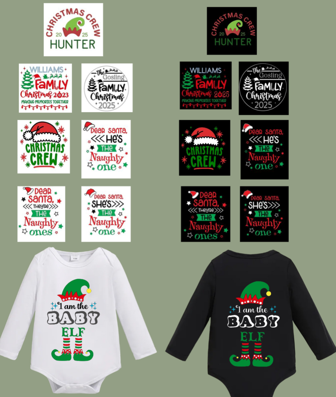 Personalised baby Christmas vest. Choose from 8 designs, in black or white and long sleeved or short sleeved.