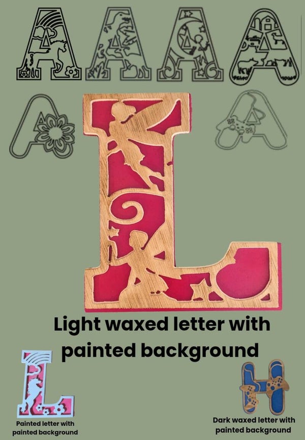 40 cm wooden letters are available with themes like fairies, flowers, unicorns, dinosaurs, gaming, and farms in various colours. You can choose the letter and background colours for painted letters with painted backgrounds, or select a background colour for light and dark waxed letters. Discounts are offered for multiple letters, so specify how many you’d like and which letters you want.
