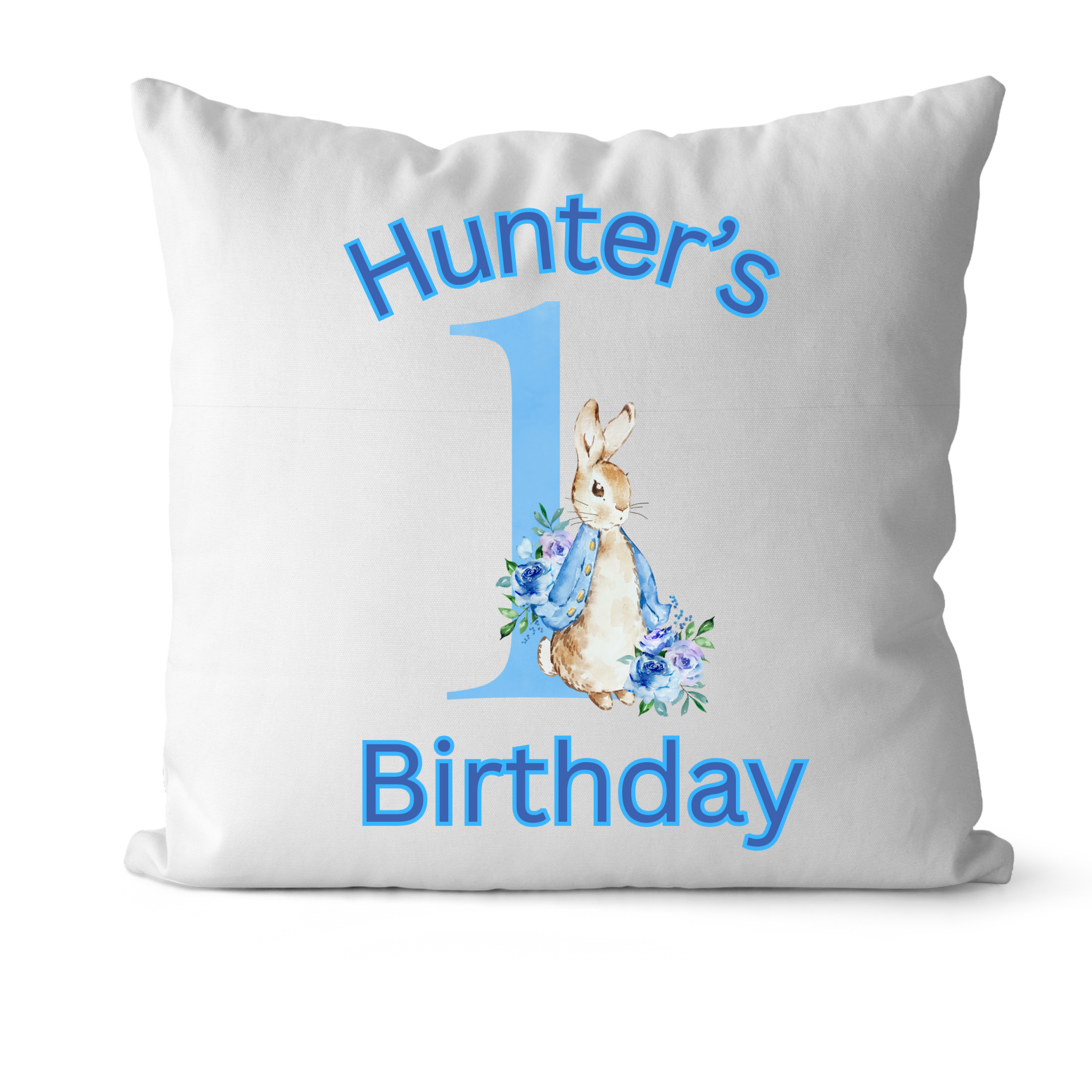 40x40 cm Cushion, Rabbit theme, colours in pink or blue. persoanlised with a name and birthday age.