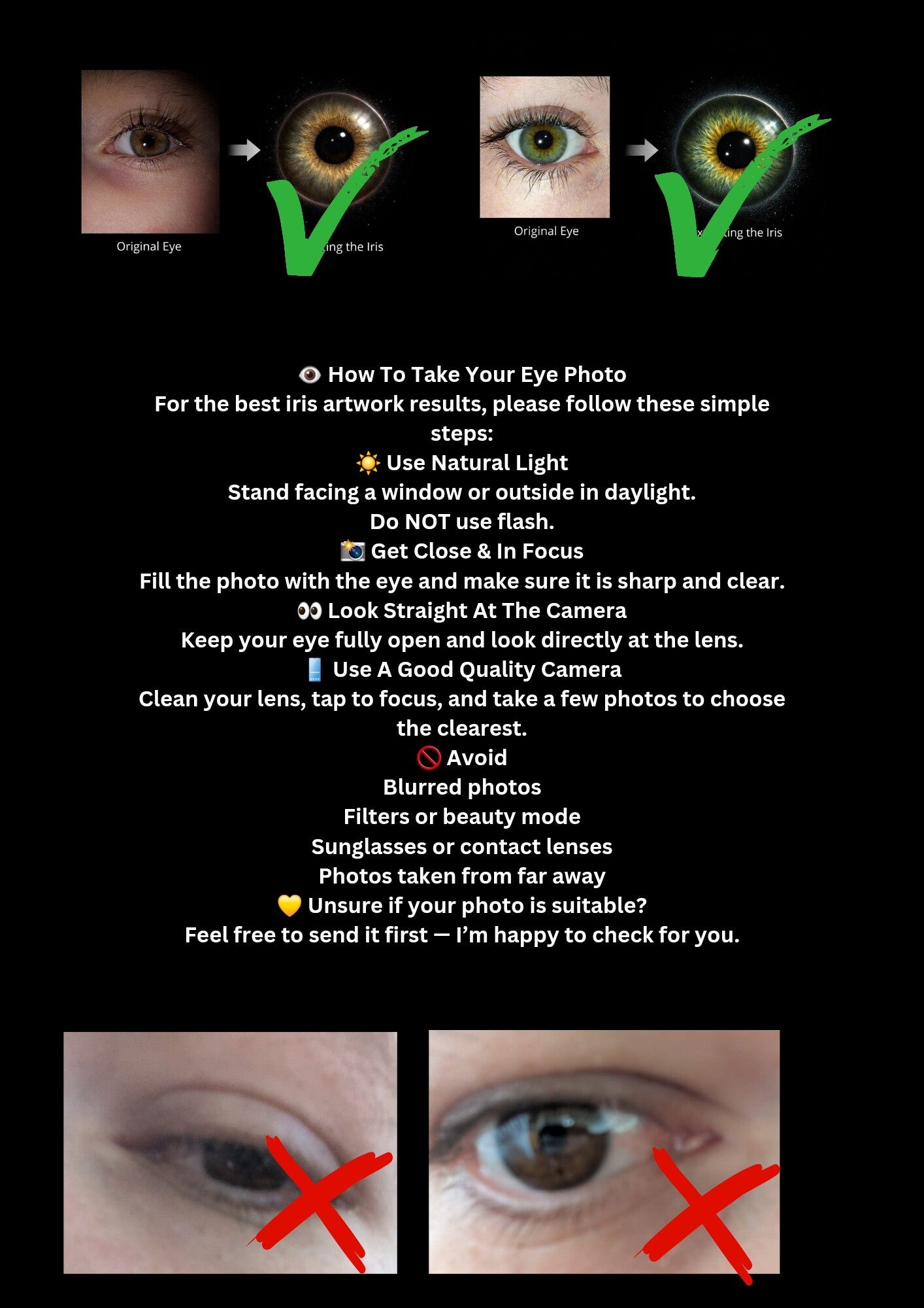 Every design is handmade with care, ensuring each iris remains completely unique and true to the original eye photograph.